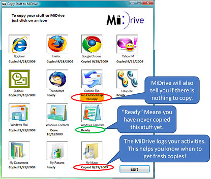 The user experience is based on MiDrive’s ability to tell you what and when you last backed up your stuff. Below is a screen shot of the MiDrive solution.